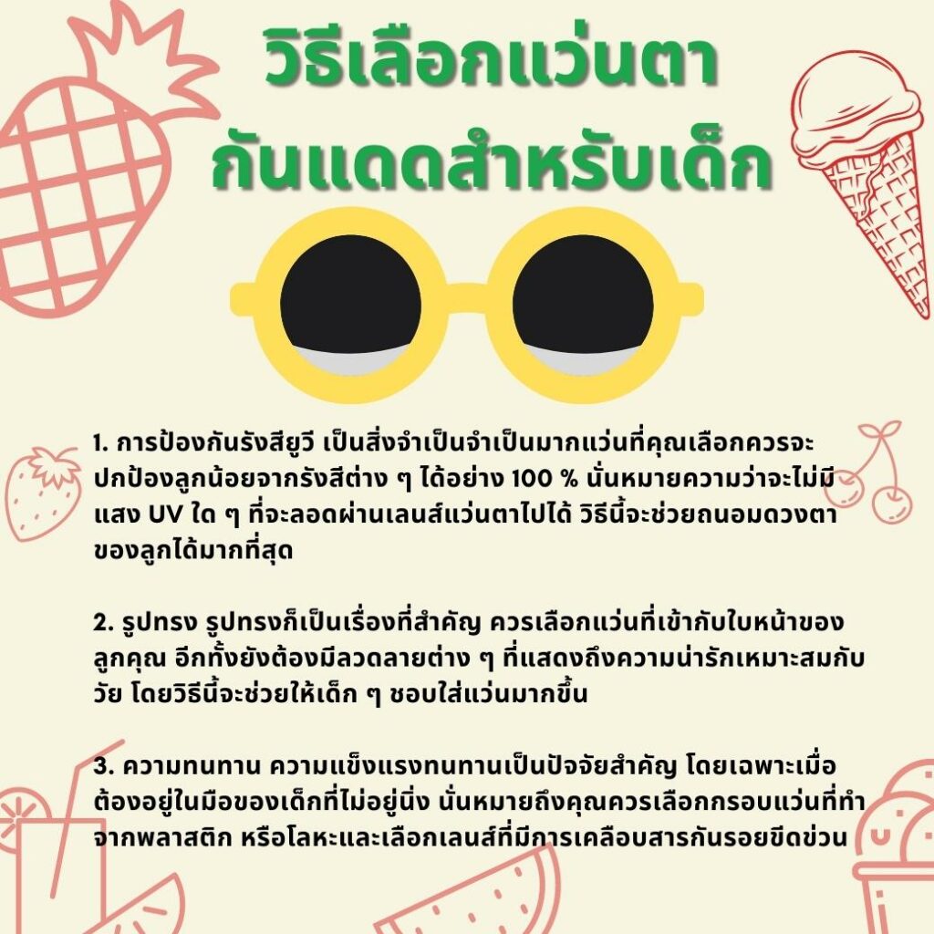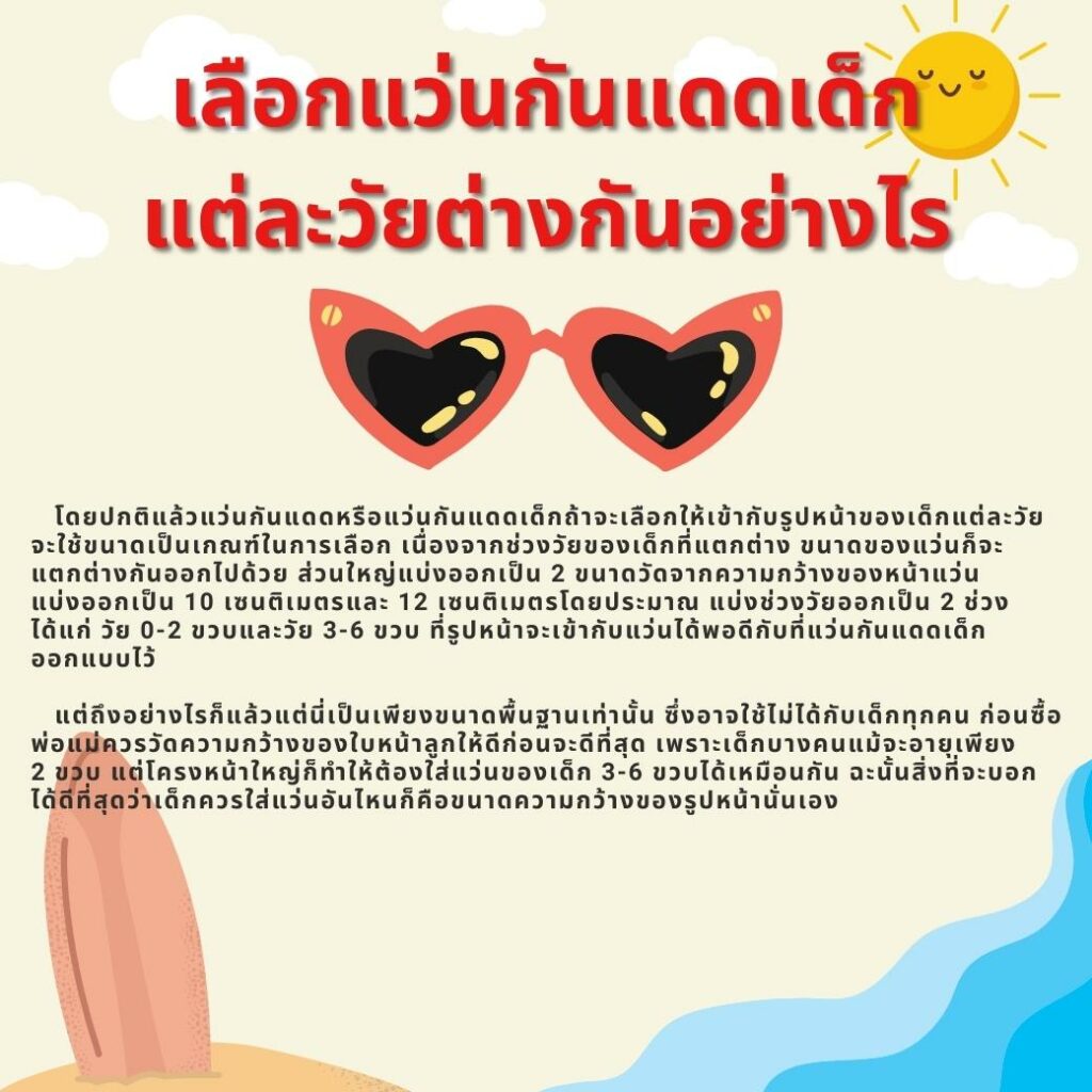 แว่นตากันแดดเป็นสิ่งจำเป็นมาก ๆ สำหรับเด็ก เป็นเพราะรังสียูวีจากแสงแดดจะเป็นตัวทำลายจอประสาทตาและแก้วตาซึ่งนานวันเข้าก็จะส่งผลเสียกับดวงตาในระยะยาวด้วย ยิ่งแสงแดดแรงมากเท่าไหร่ สายตาก็จะถูกทำร้ายมากขึ้นเท่านั้น และมันจะดีมาก ๆ หากพ่อแม่ทุกคนฝึกให้ลูกใส่แว่นตากันแดดตั้งแต่ 2-3 ขวบ เพราะสายตาของเด็กวัยนี้ค่อนข้างไวต่อการกระตุ้นและพวกเขาเองก็เริ่มใสแว่นตาได้แล้ว และการฝึกให้ลูกใส่แว่นกันแดดบ่อยๆ จะช่วยลูกเคยชินและใส่เป็นประจำทุกครั้งที่เจอแดด