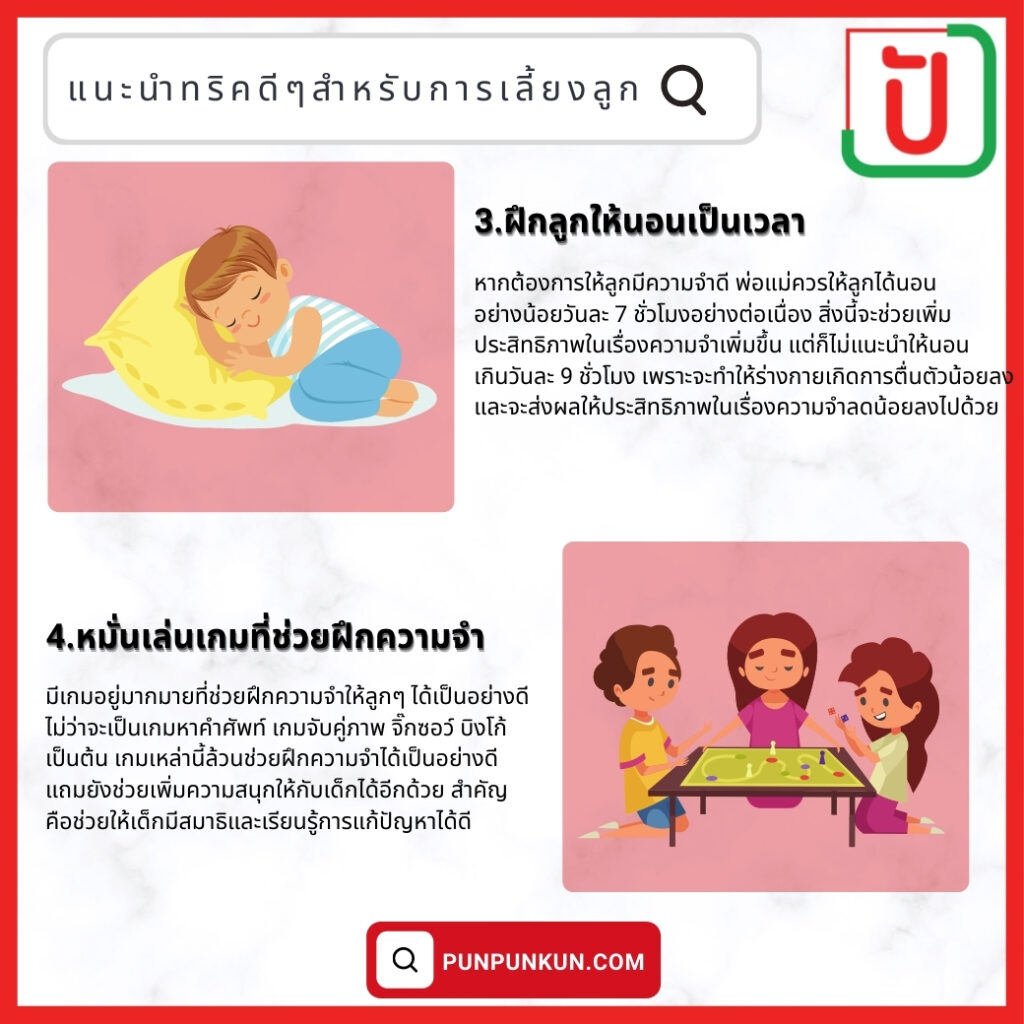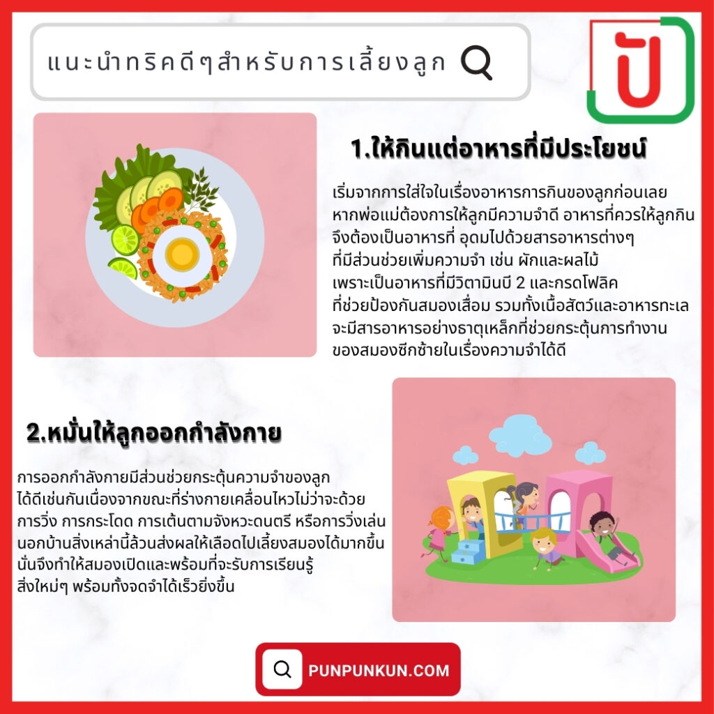 วิธีการฝึกลูกให้มีความจำและพัฒนาการเรียนให้ดีขึ้นนั้น ล้วนเป็นวิธีง่ายๆ ที่พ่อแม่สามารถทำได้ แต่ทั้งนี้ก็อาจจะต้องอาศัยการให้เวลาแก่ลูกมากมายด้วยเช่นกัน เพื่อที่พ่อแม่จะสามารถทำกิจกรรมต่างๆ เหล่านี้ไปพร้อมๆ กับลูกได้นั่นเอง